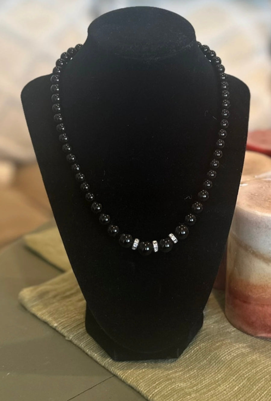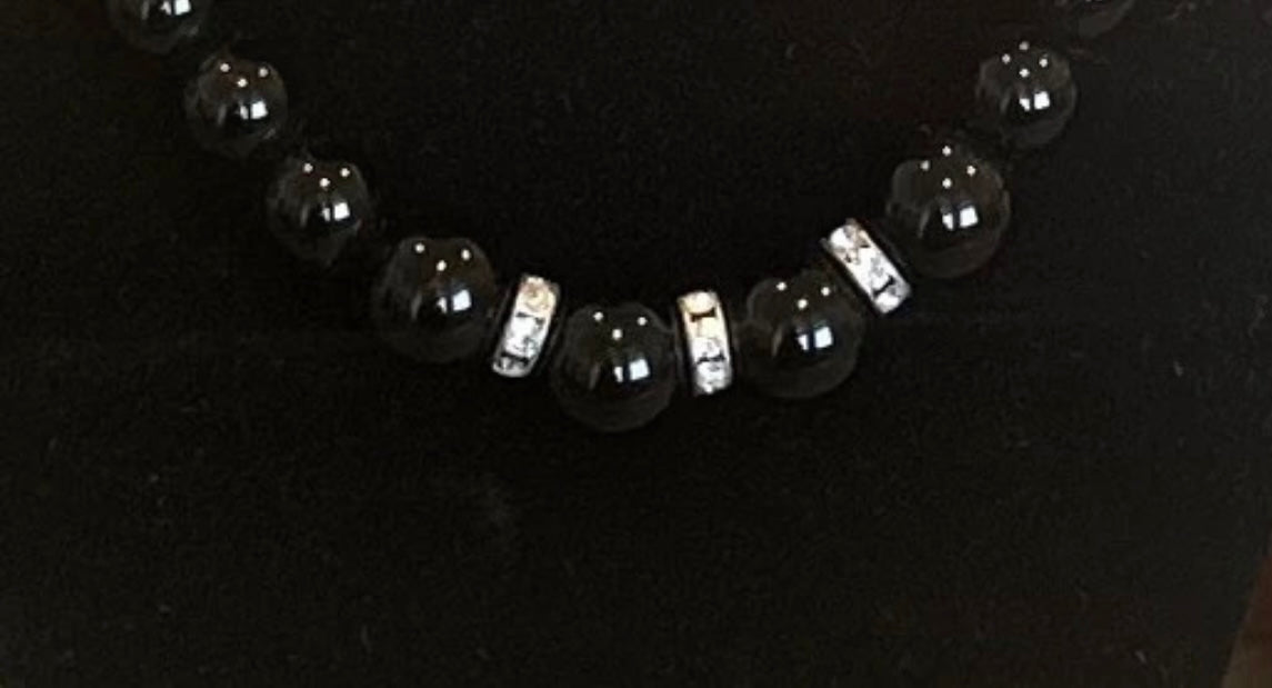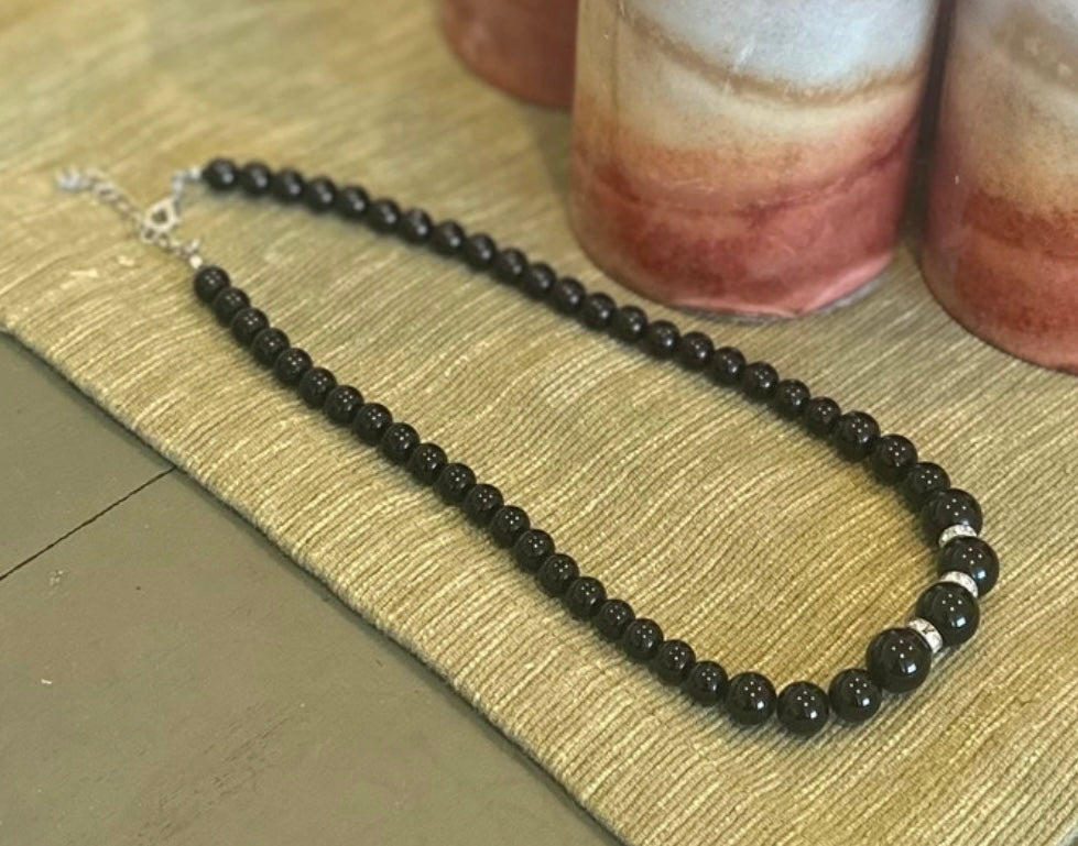 Black Ceramic Bead and Silver Tone Necklace With Clear Rhinestones, 16.5 Inches Long Necklace