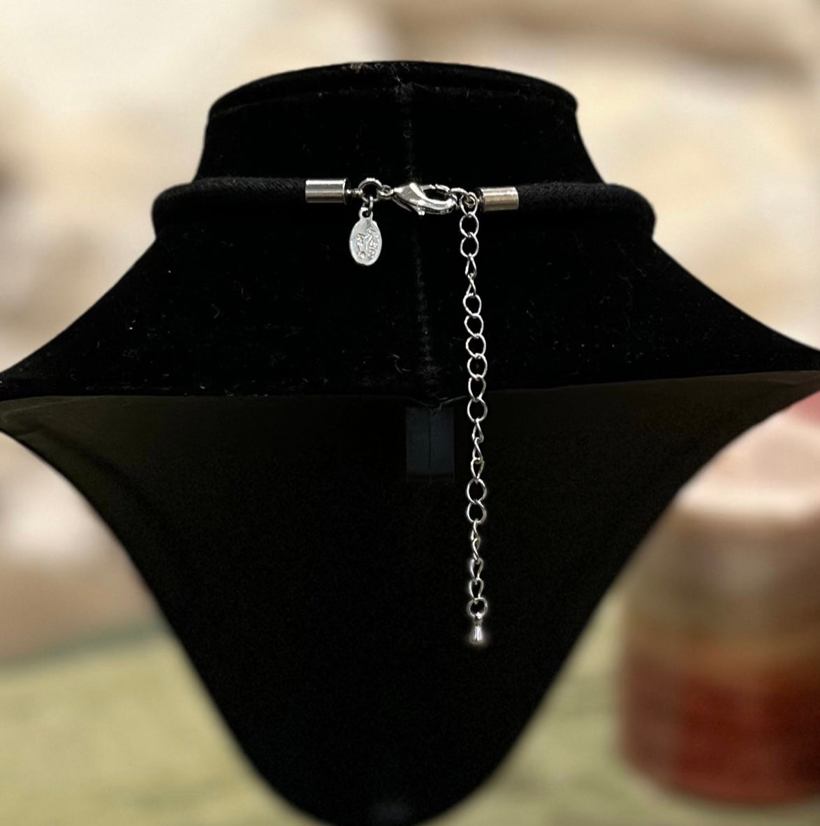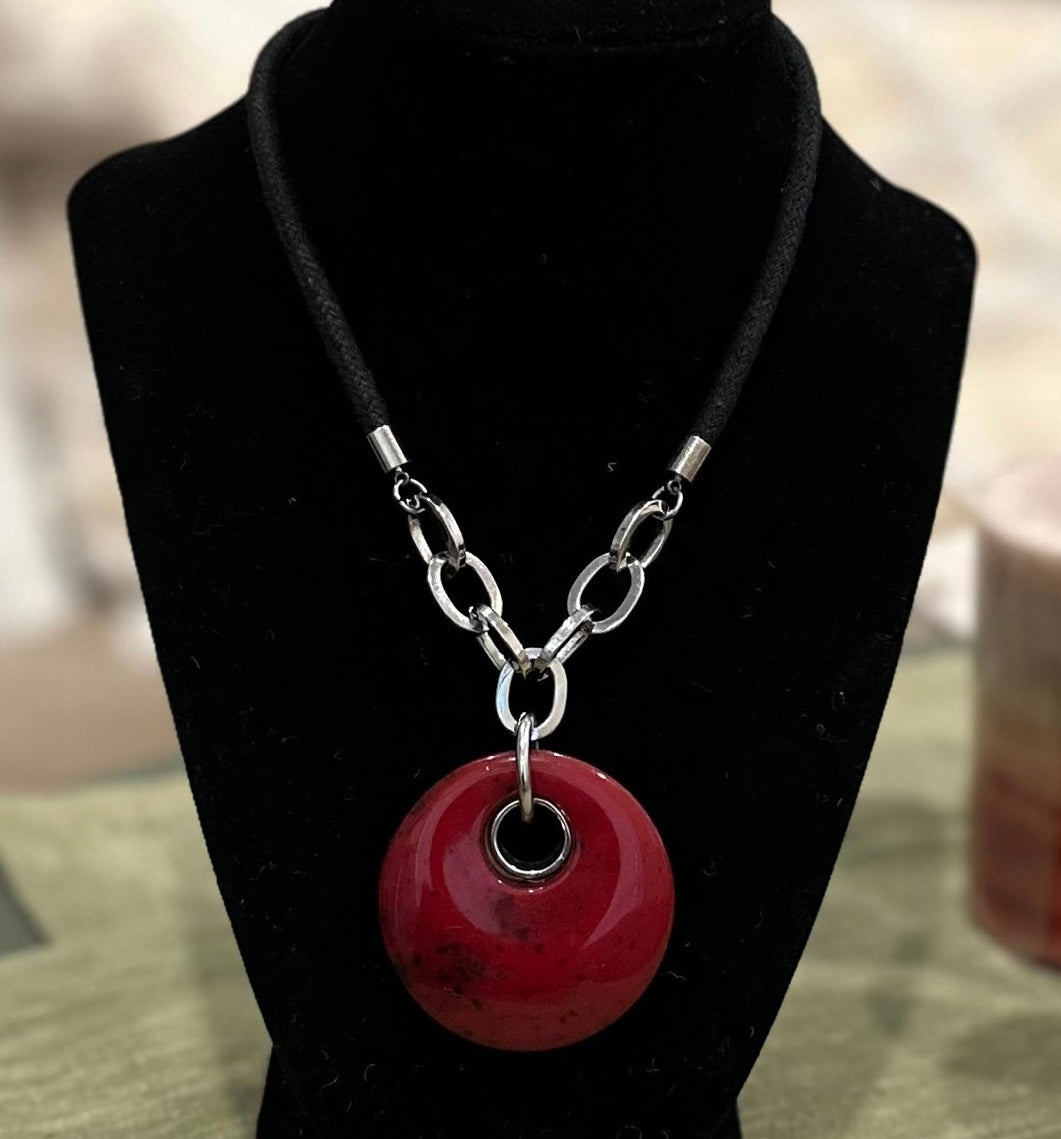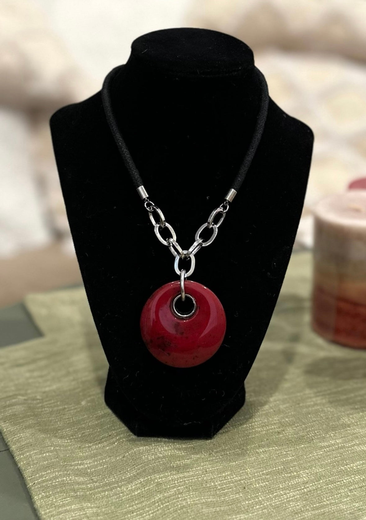 Cookie Lee Red Round Pendant Black Cord 15” Necklace Silver Tone Link and 3” Extension