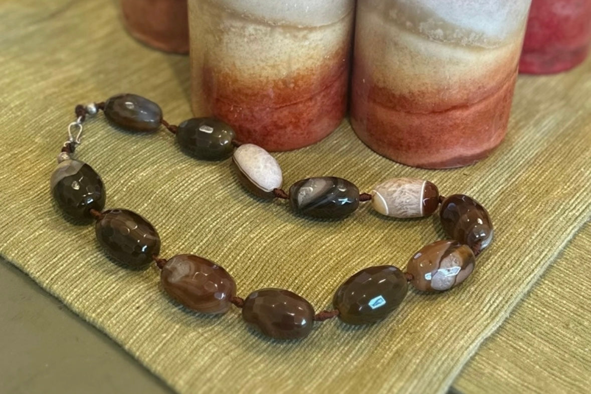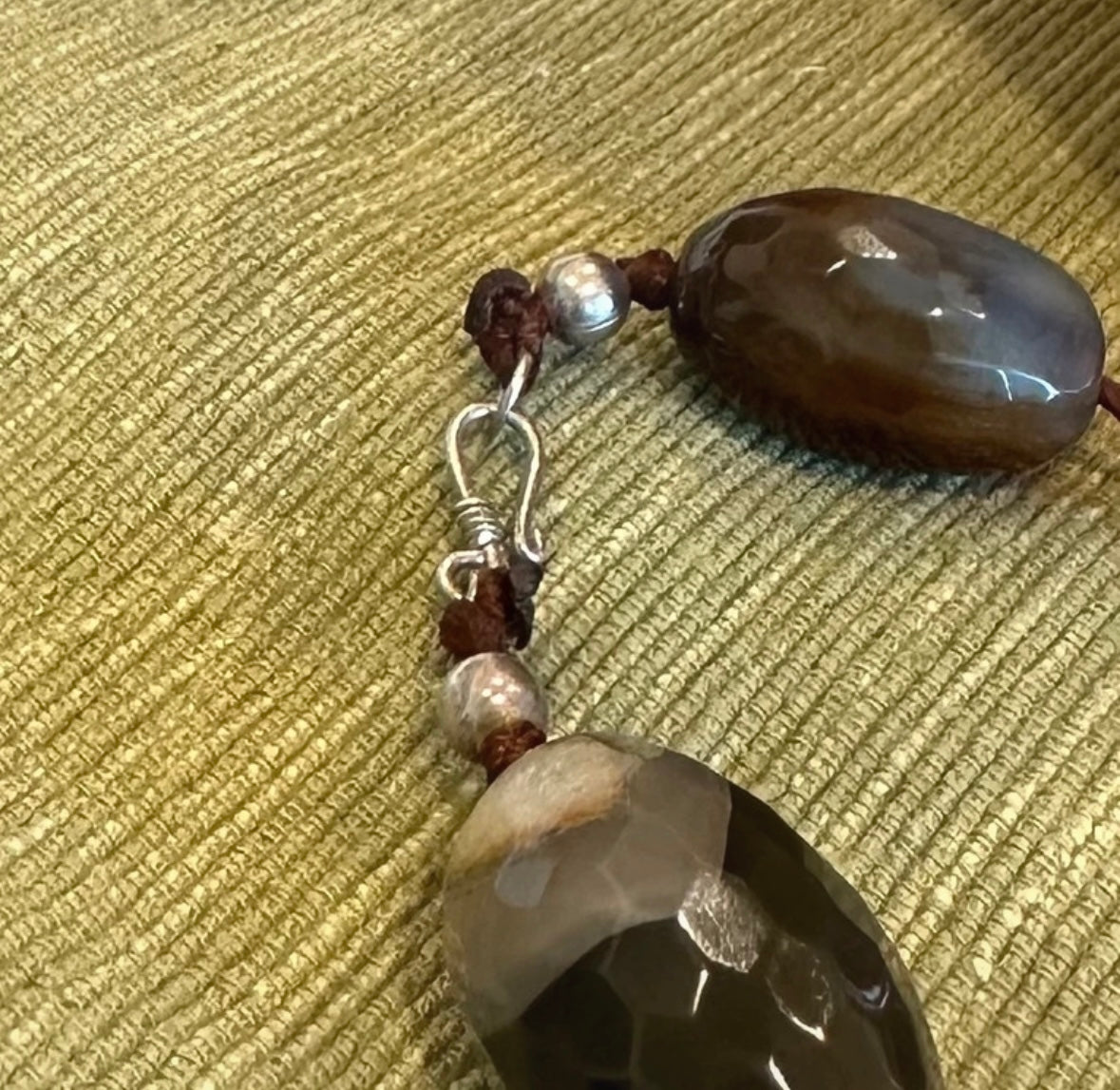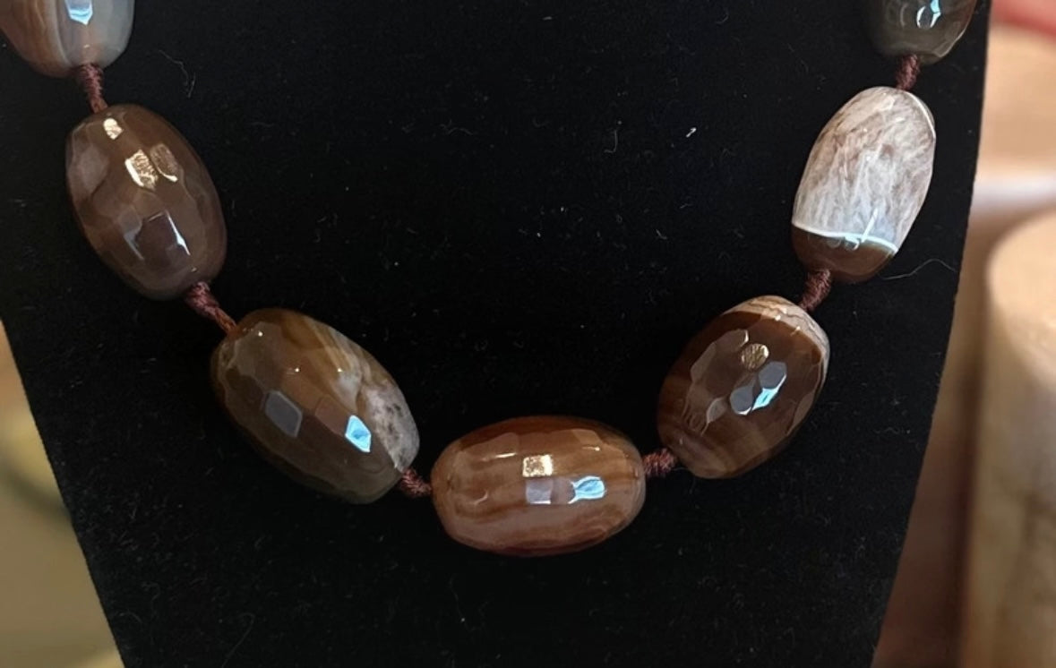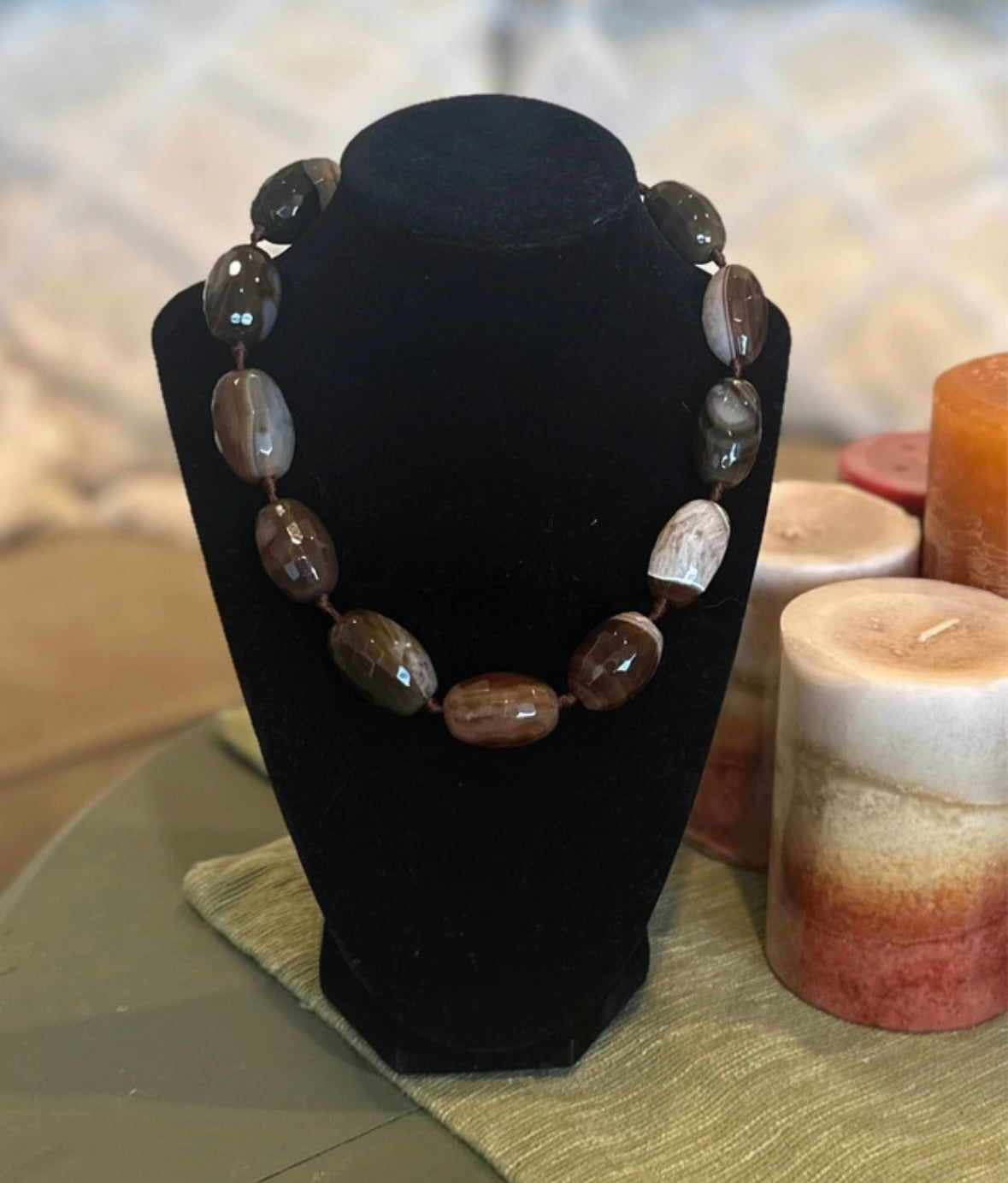 17" inch choker necklace with brown, white, and tan colored barrel faceted glass beads. This is a heavy necklace with a gold tone hook.