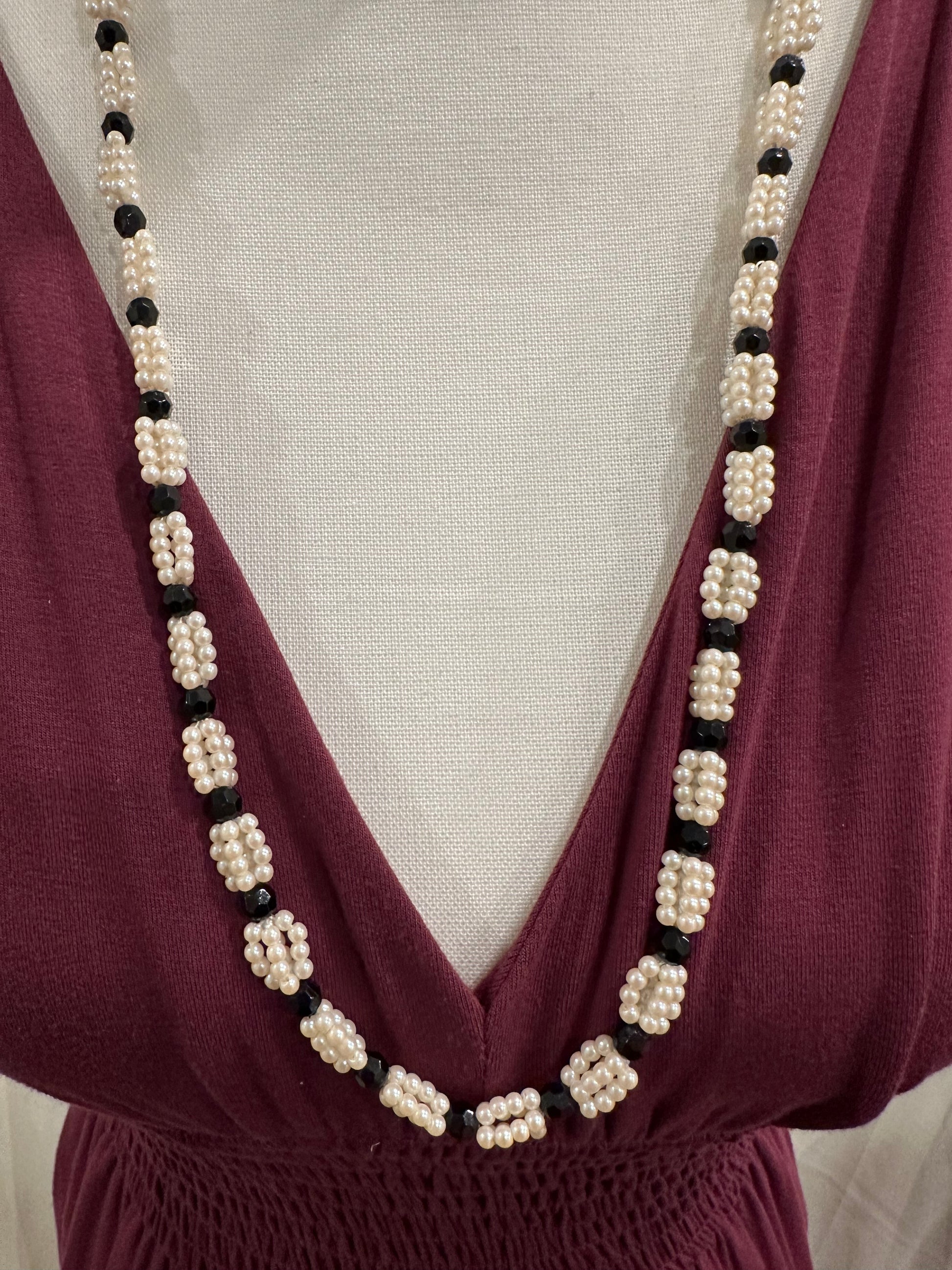 Single strand white faux pearl beads and black faceted bead 27” inches long necklace with gold lobster hook. Very light weight necklace.