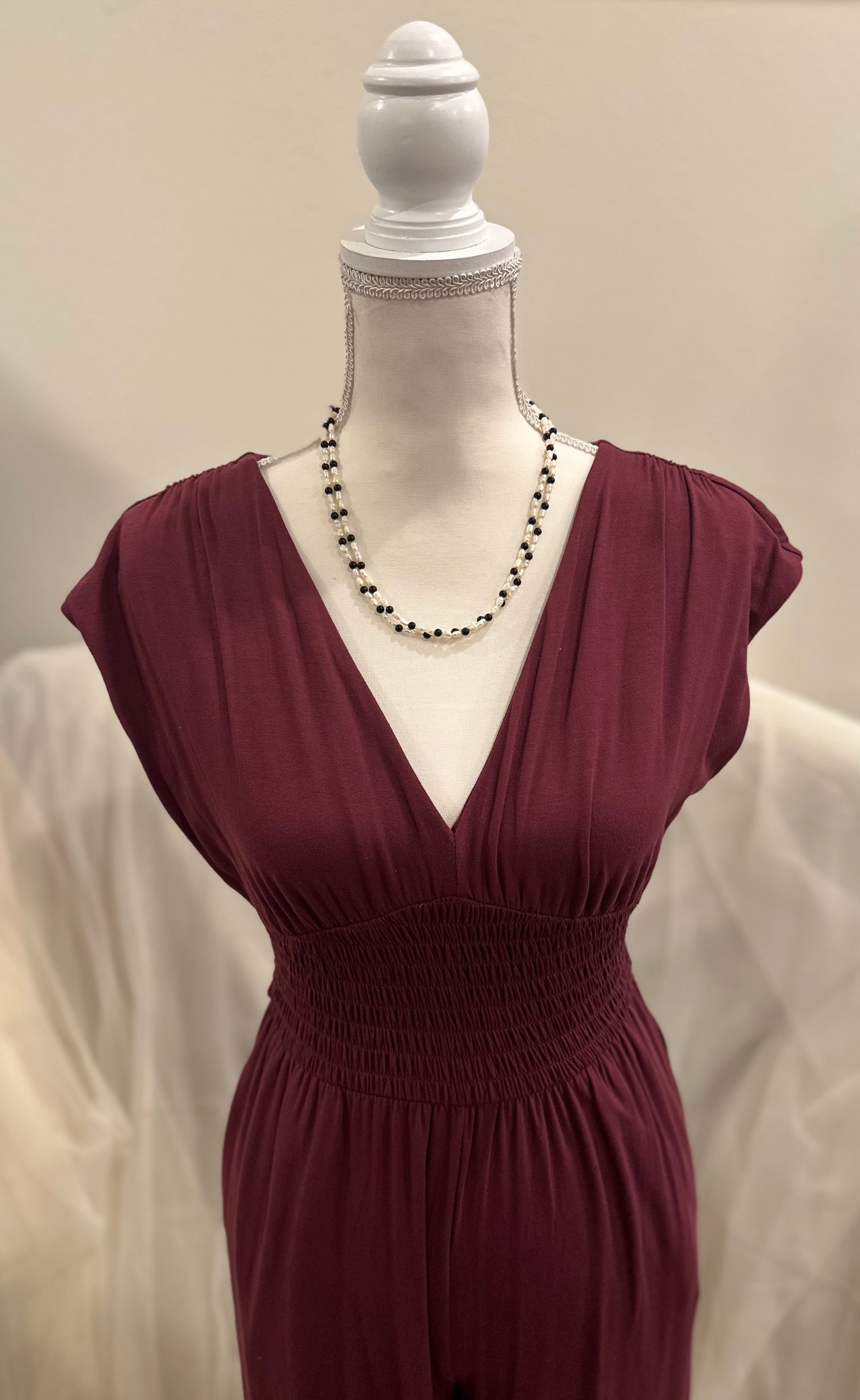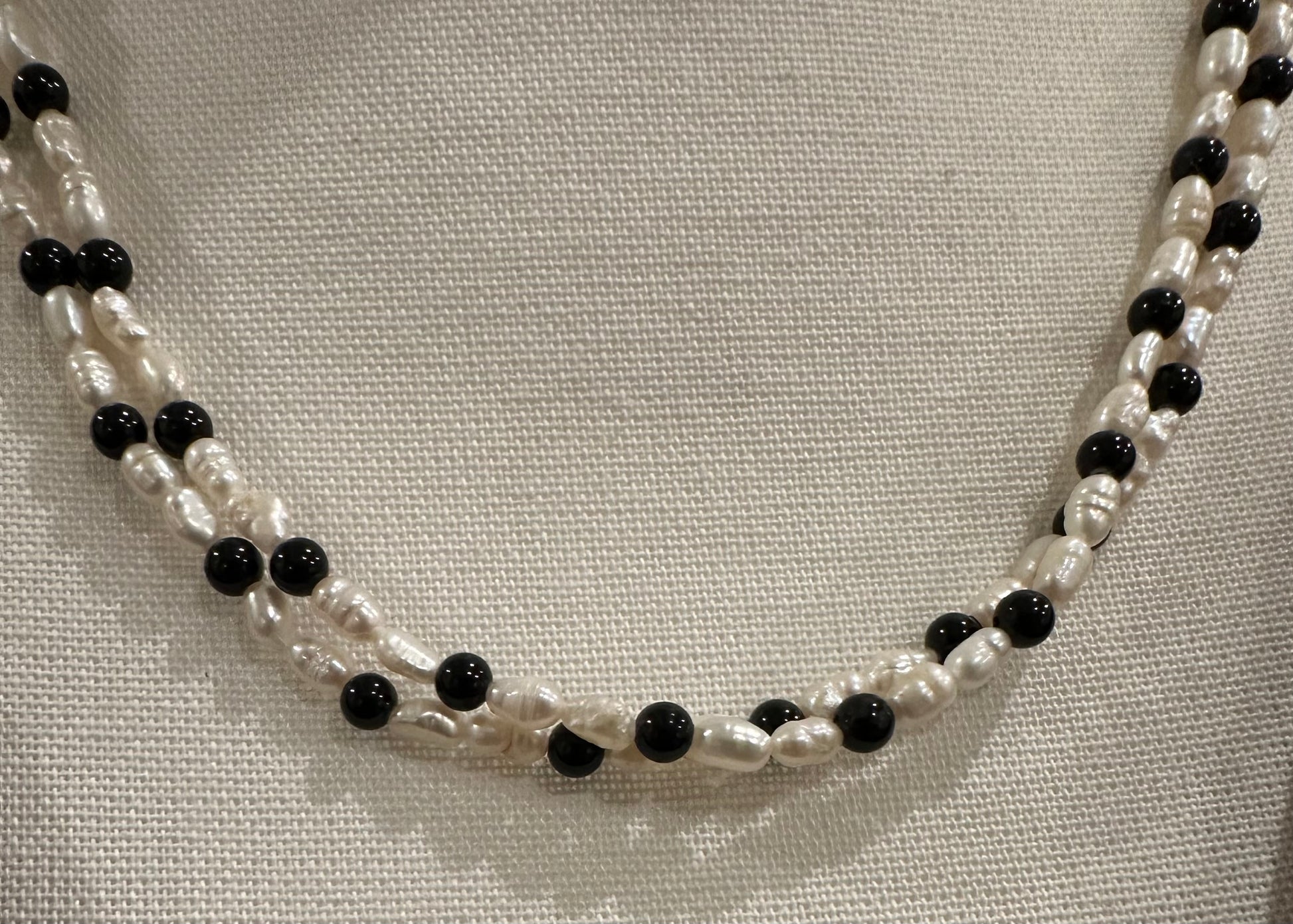 Vintage freshwater rice pearl necklace with 4mm black beads are likely a type of gemstone. Two strands of irregular elongated rice pearls averaging 7mm x 3mm. Total length 20 inches with a gold tone pearl topped box clasp.
