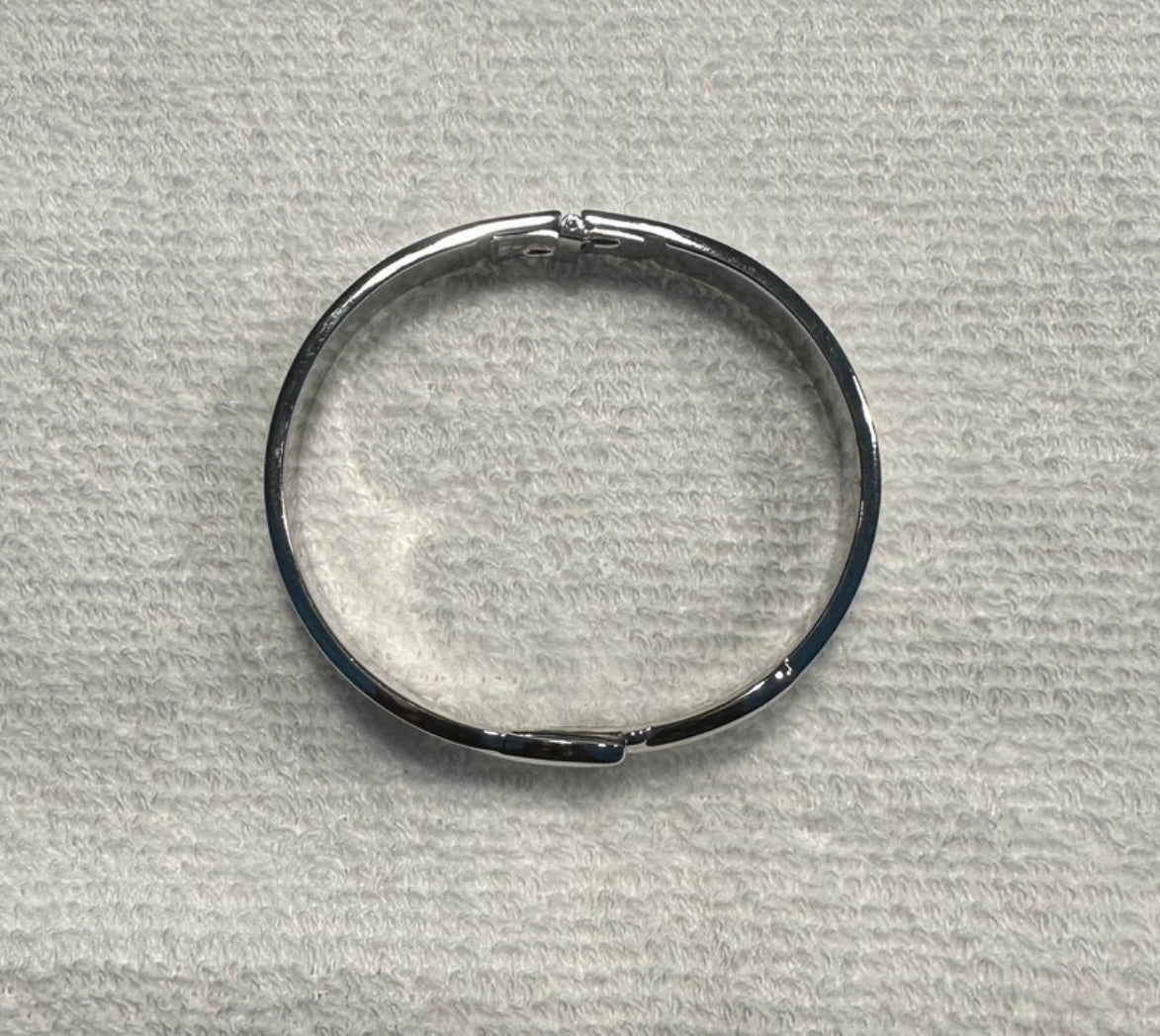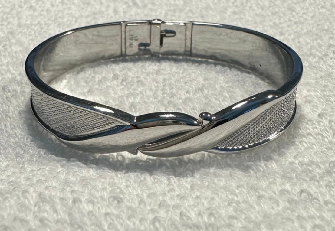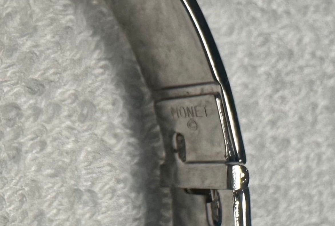 A vintage signed Monet clamper bracelet, silver tone finish inside and out. The band is 3/8 inch wide and the bracelet is 7 inches around so it fits a smaller wrist.