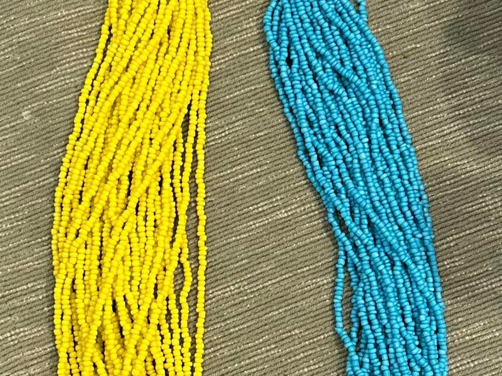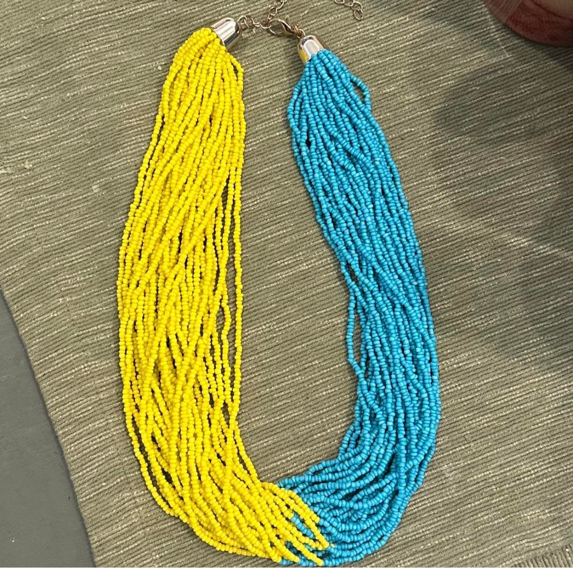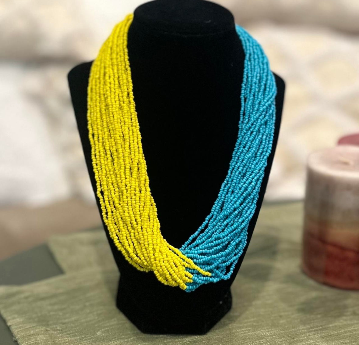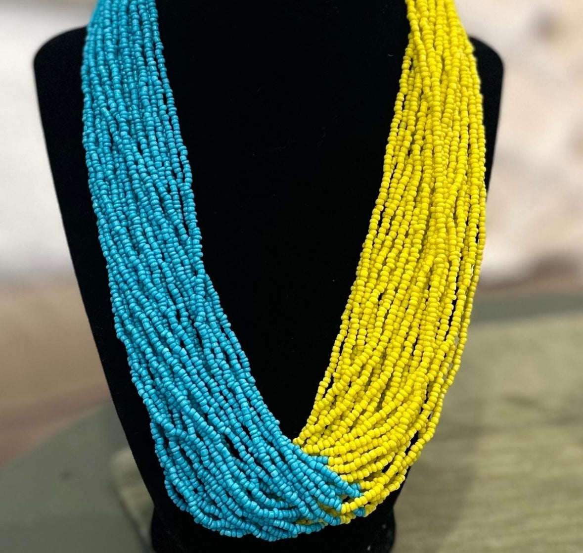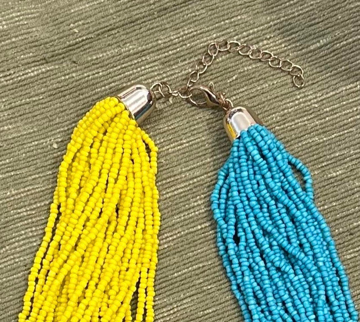 Turquoise and Bright Yellow Glass Seed Beads Choker 18" Inch Necklace With Gold Tone Clasp