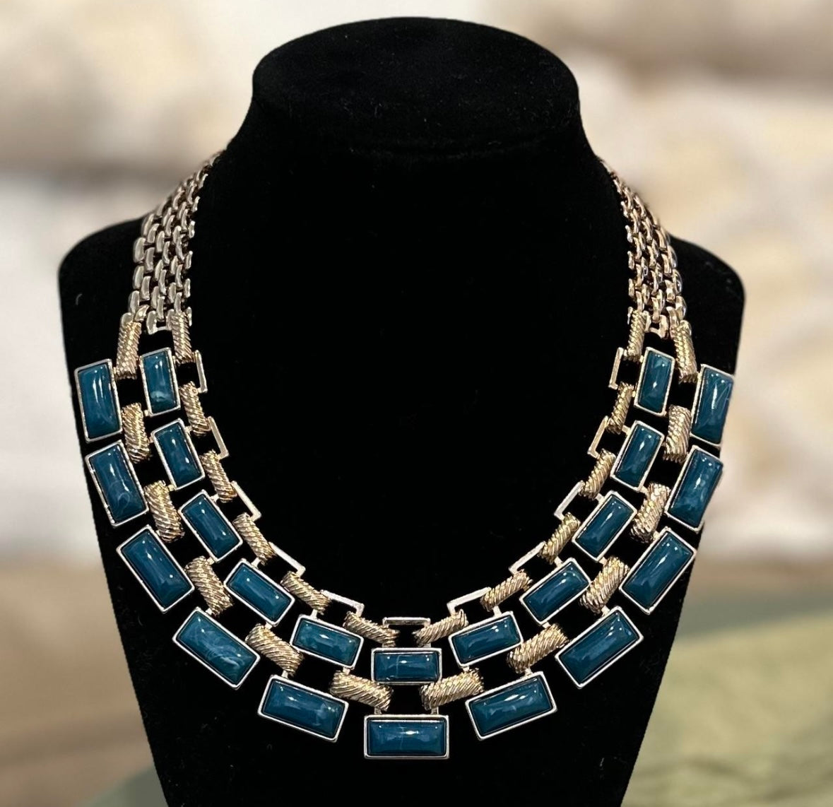Vintage Gold Tone Blue/Green Rectangle Stone Statement Choker 15" Inch Necklace with 3" Inch Extension