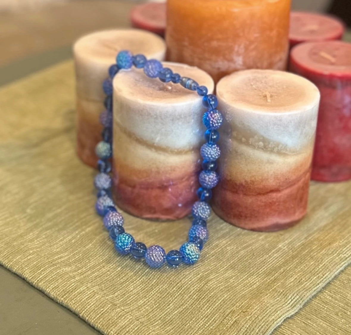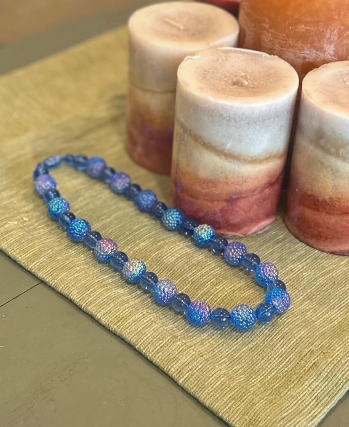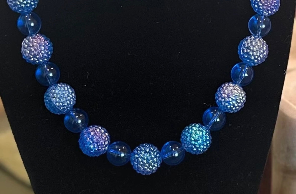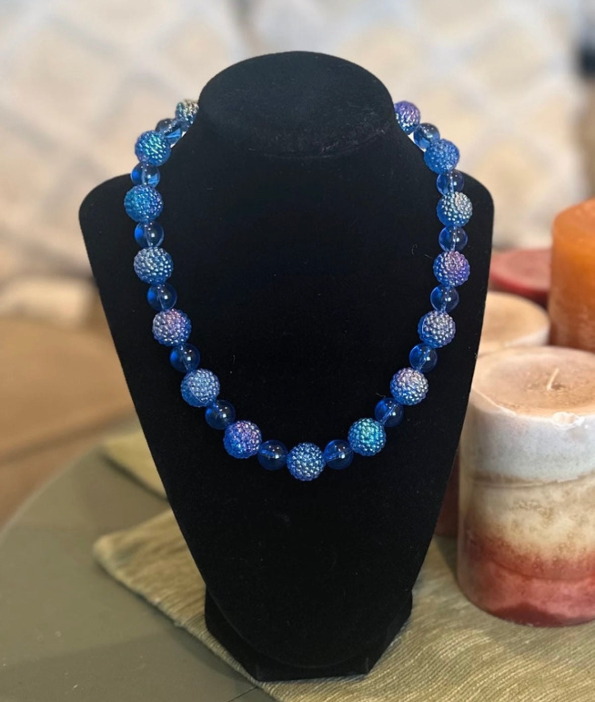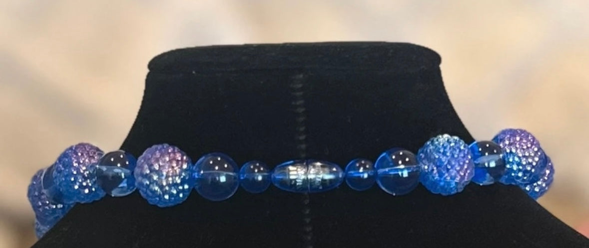 Vintage Lucite Blue Iridescent Beaded Screw Back Choker Necklace About 18" Inches Long.