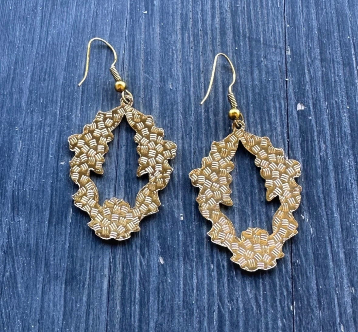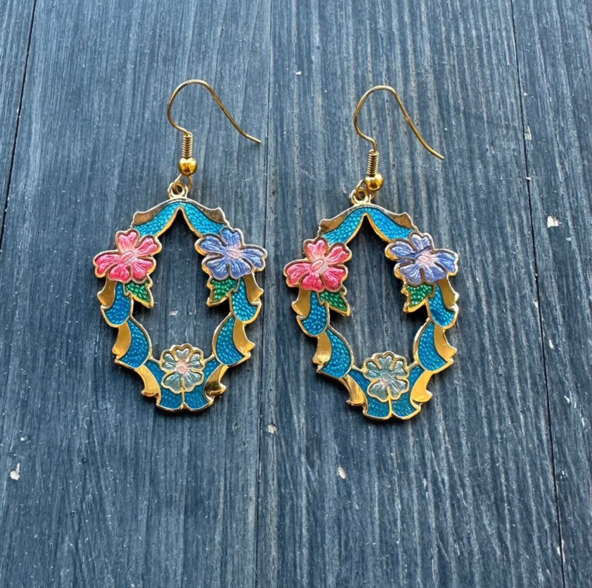 Vintage Gold Tone Cloisonne Colorful Enamel Floral Wreath Dangle Earrings 2" Inches Long