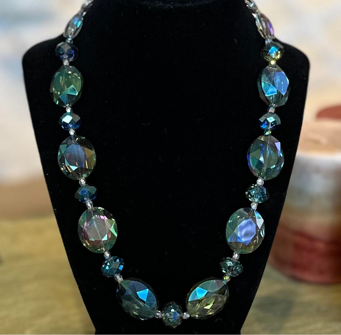 Chic Aurora Borealis faceted iridescent blue glass beads 19" inch necklace with round gold tone clasp