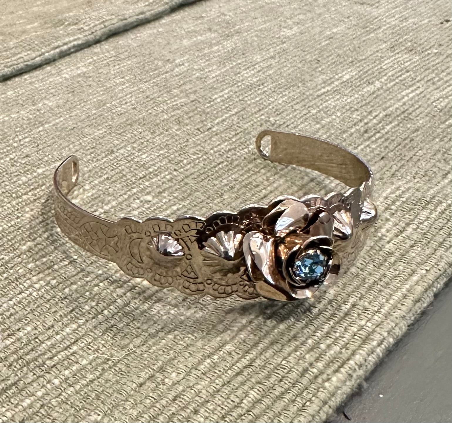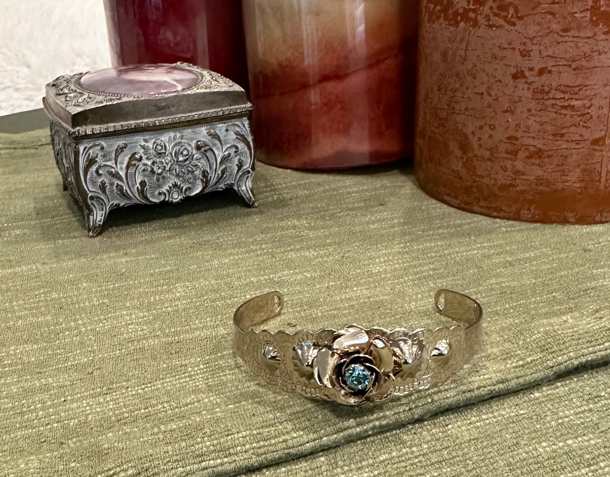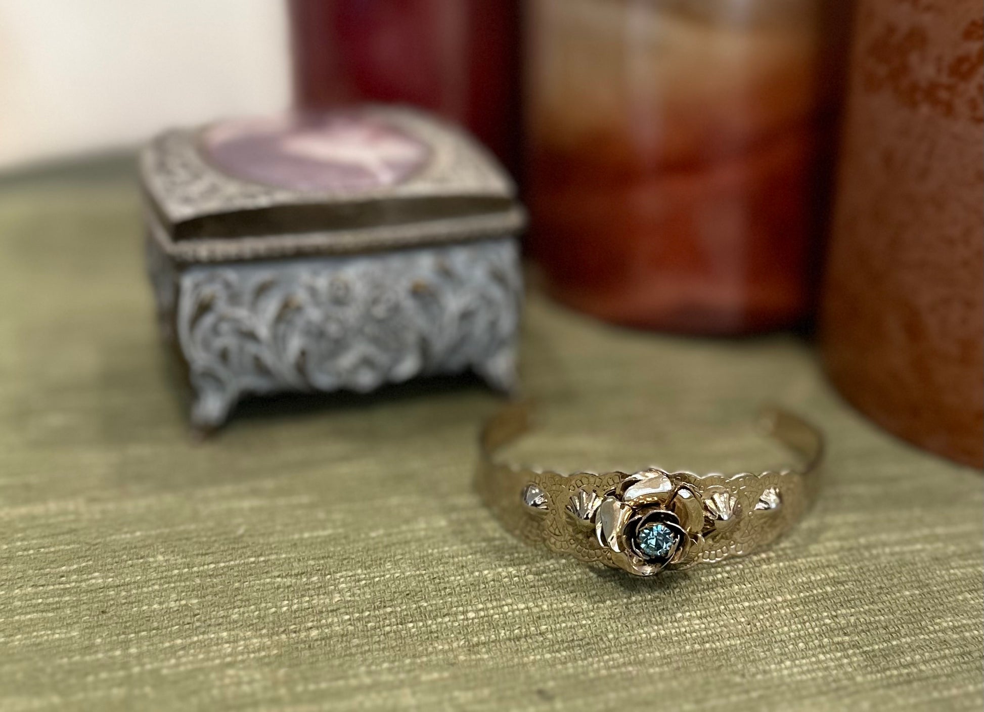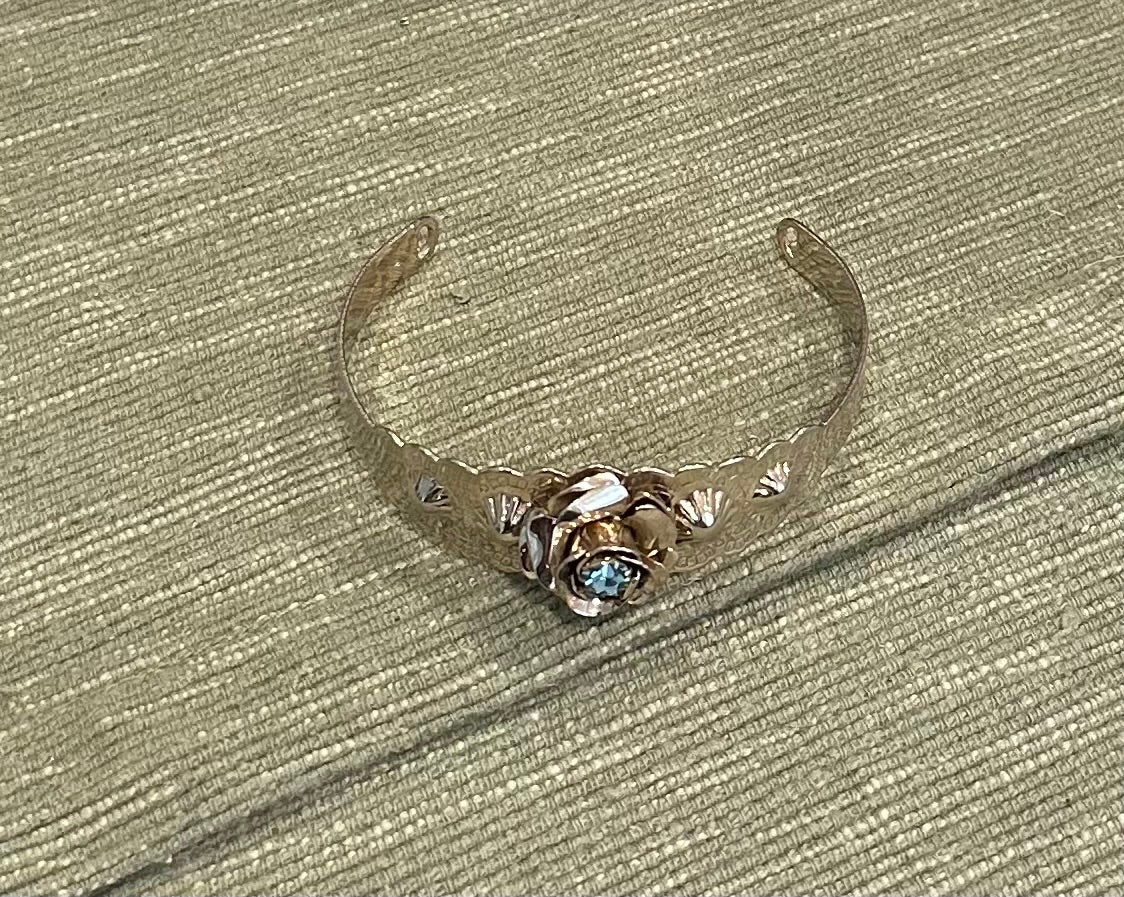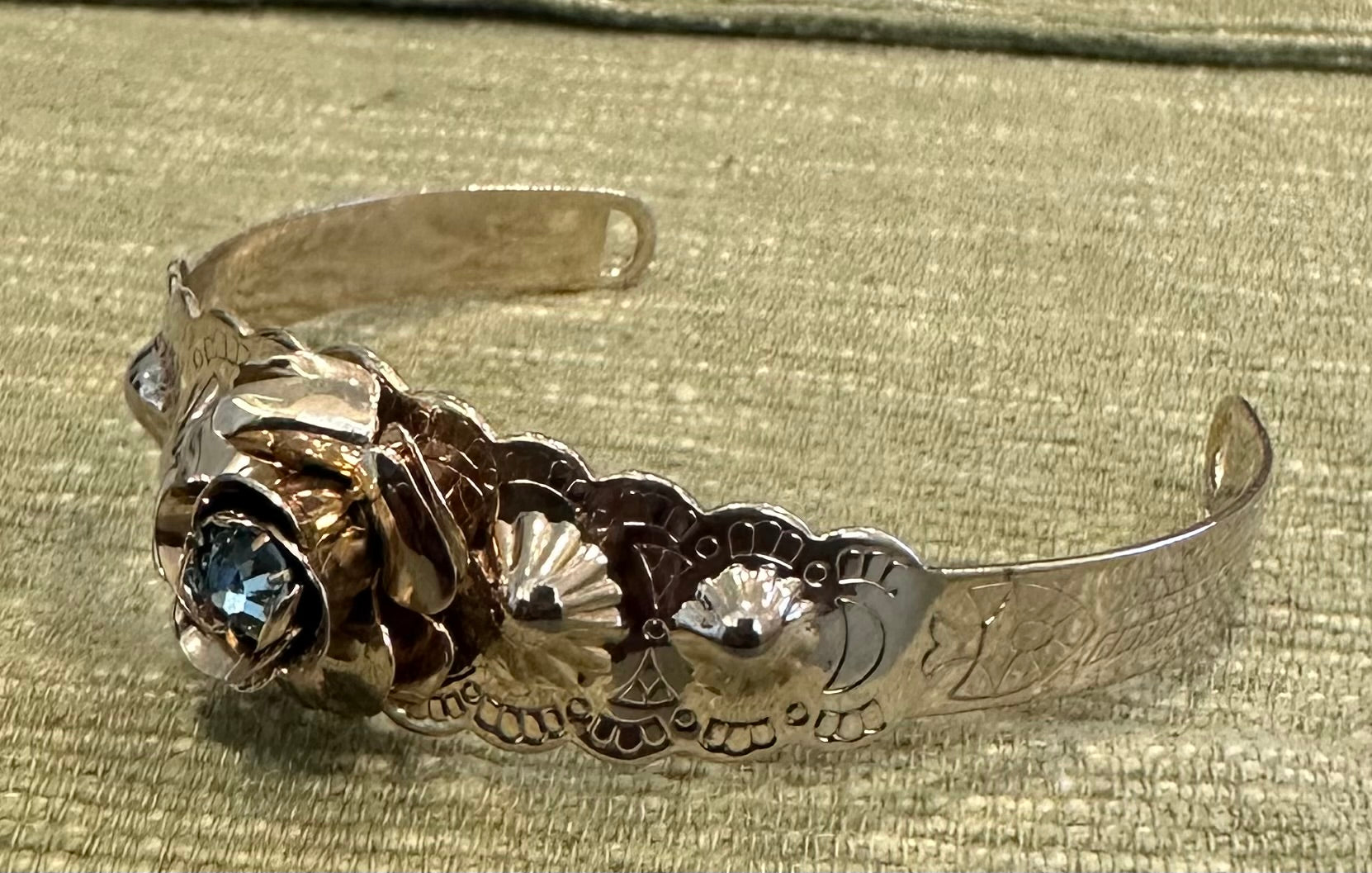 Vintage Light Blue Ornate Gemstone Flower Floral Gold Tone Brass Cuff Bracelet, measuring about 7” Inches long and Expandable