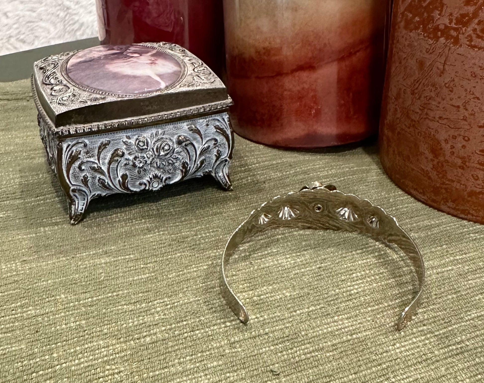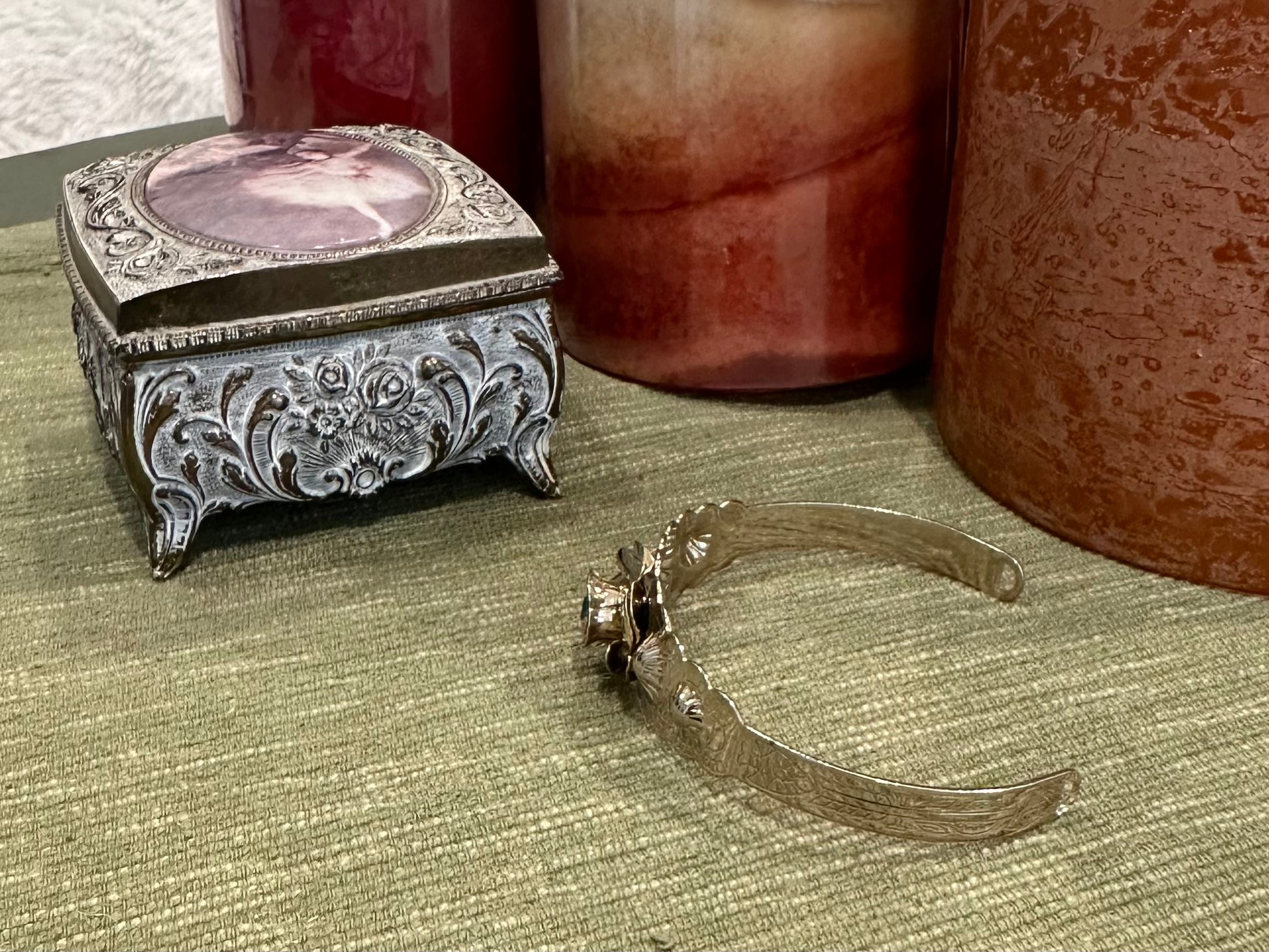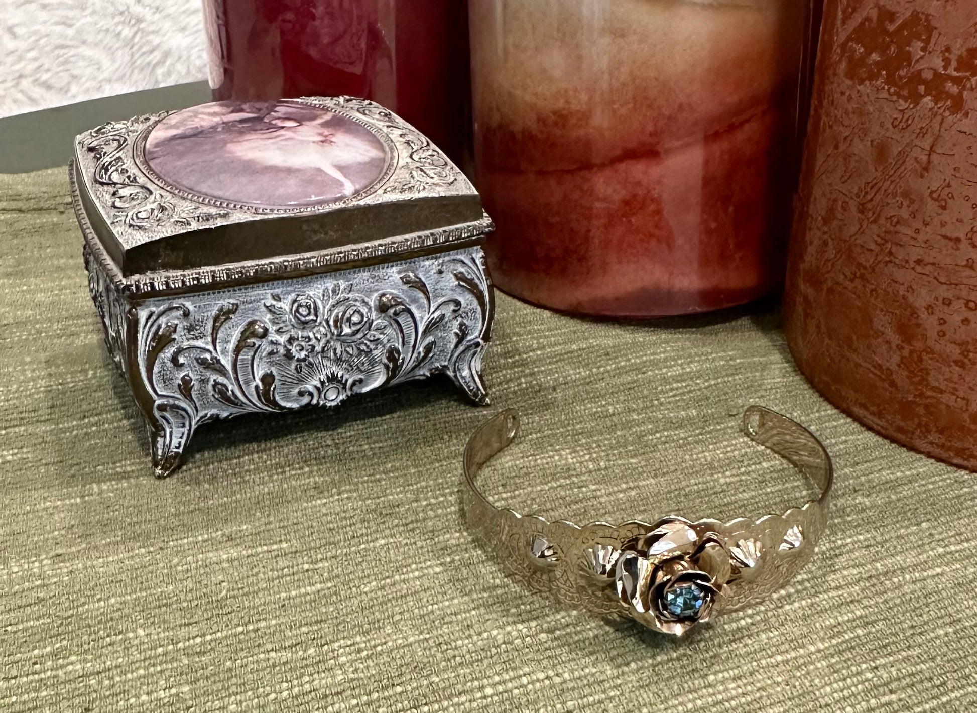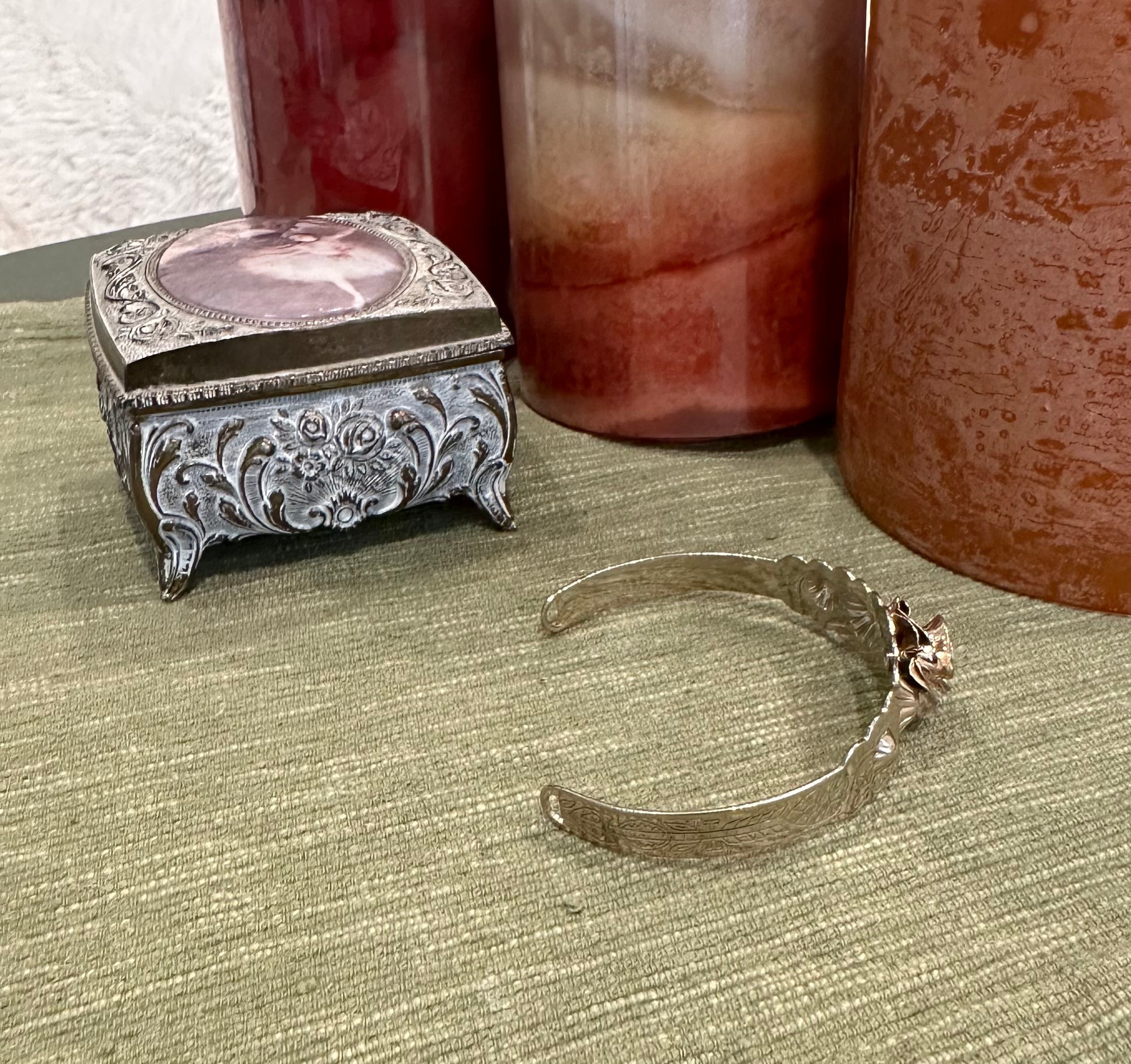 Vintage Light Blue Ornate Gemstone Flower Floral Gold Tone Brass Cuff Bracelet, measuring about 7” Inches long and Expandable