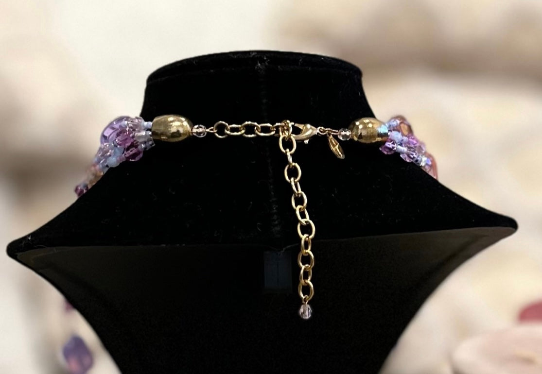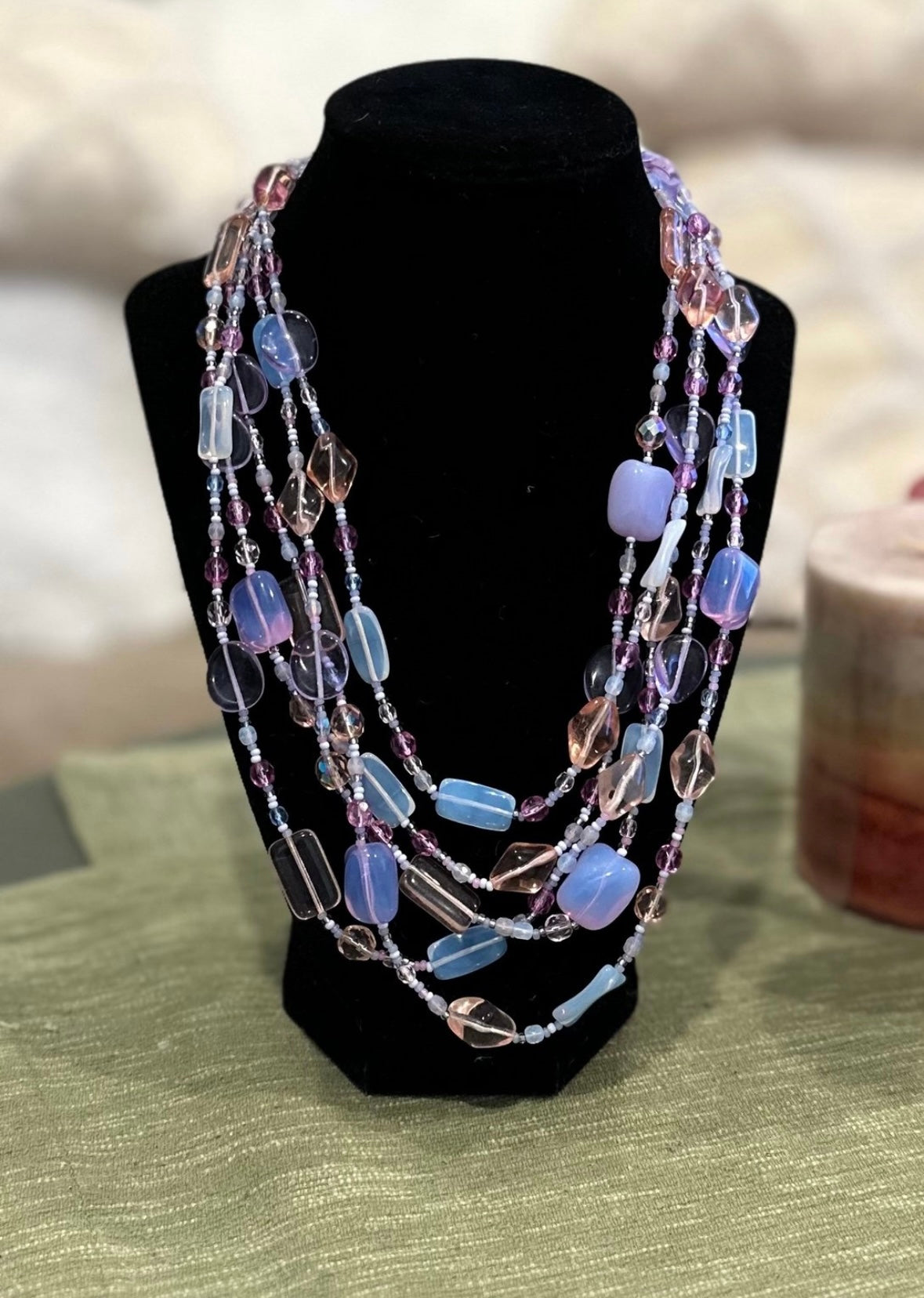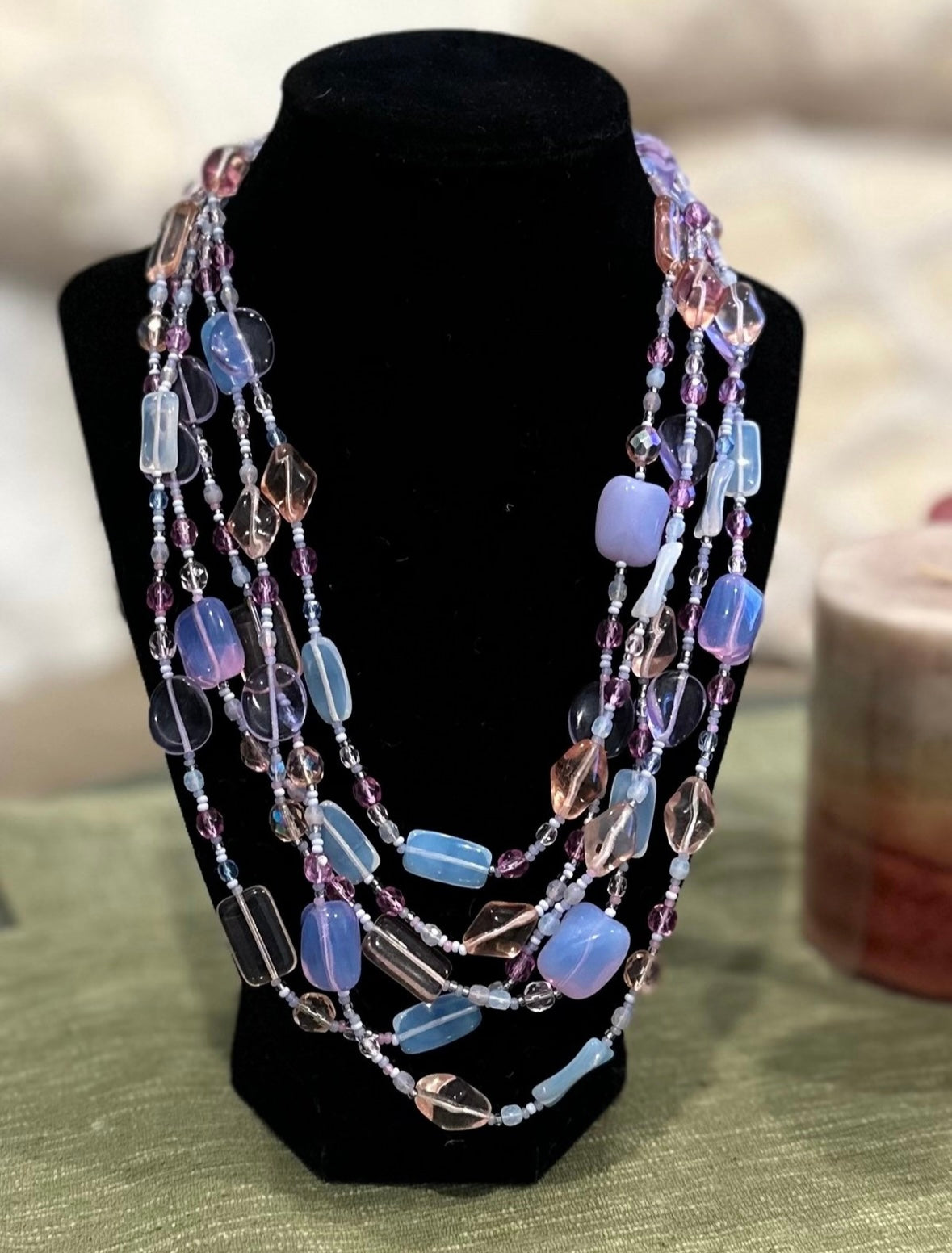 Multi strand Czech glass beads necklace by Joan Rivers, multi shaped beads of different pastel tones, lilac, pink, blue.