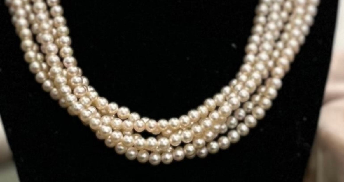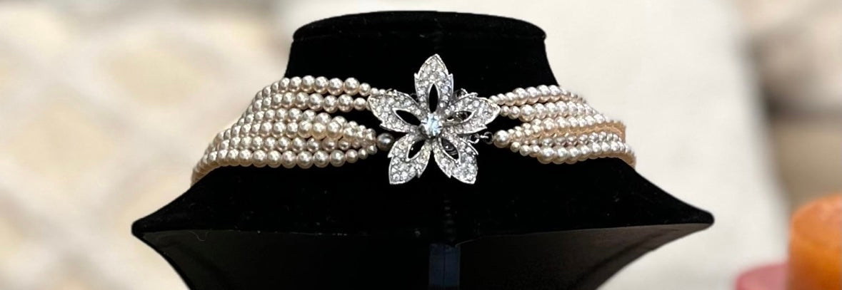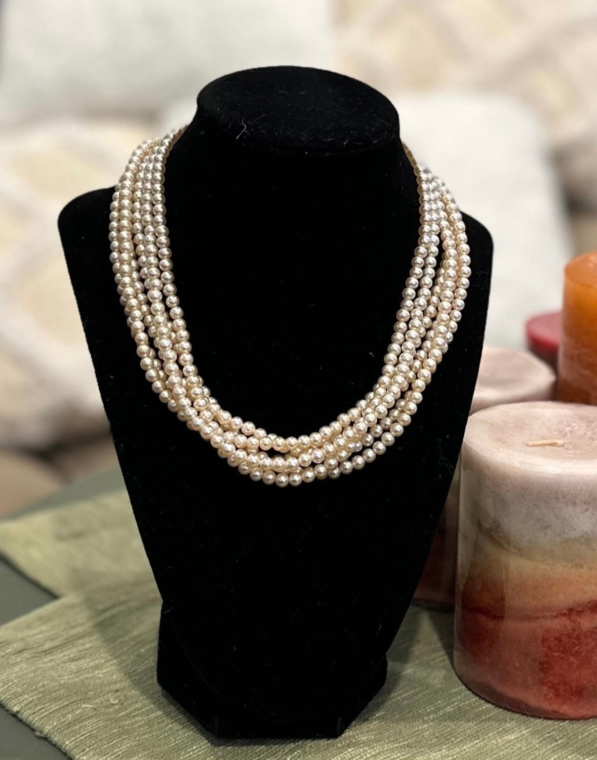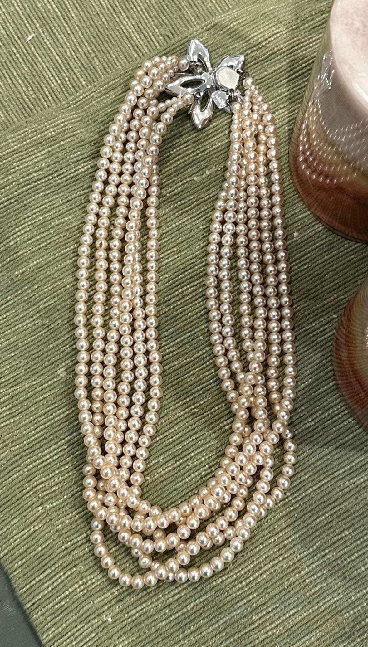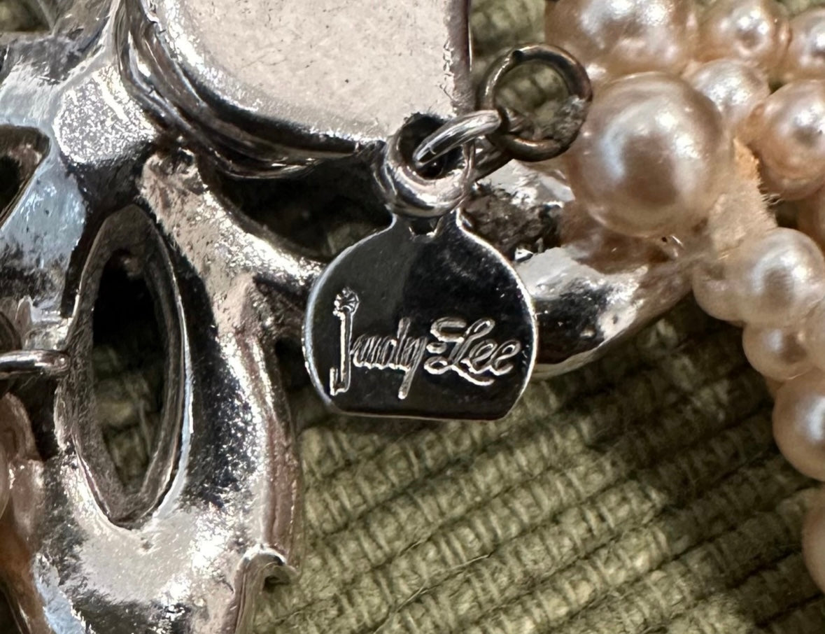 Judy Lee vintage signed silver tone faux pearl multi strand rhinestone designer 17” inch long necklace