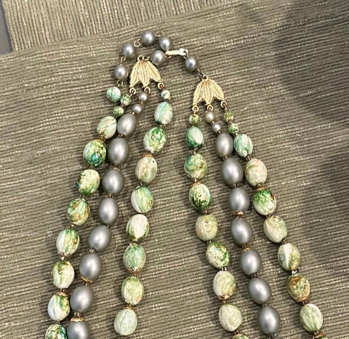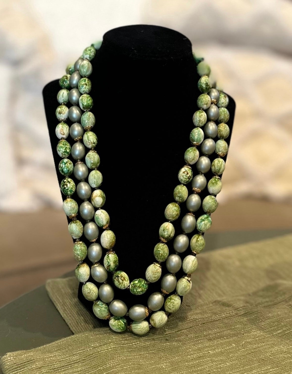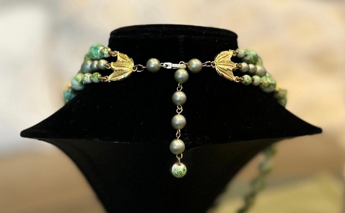 Vintage green plastic bead with gold tone accents & clasp 20" inch necklace