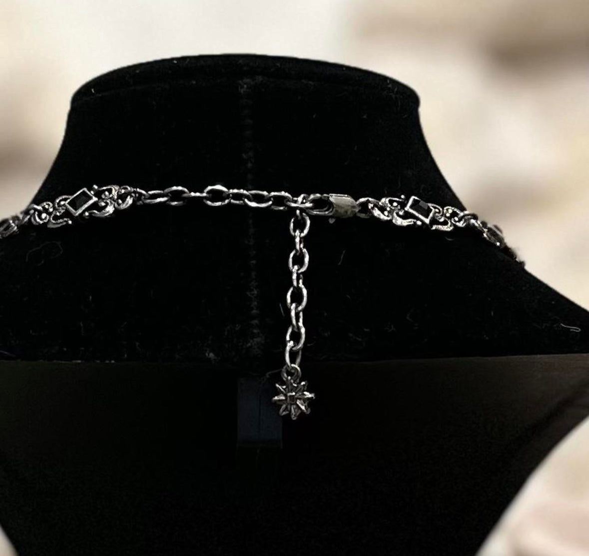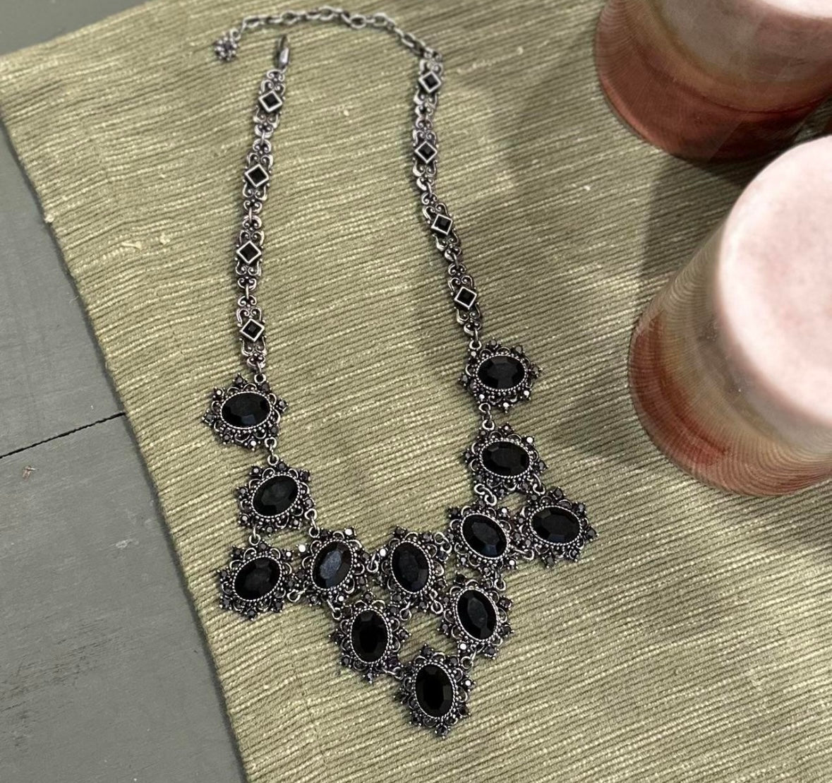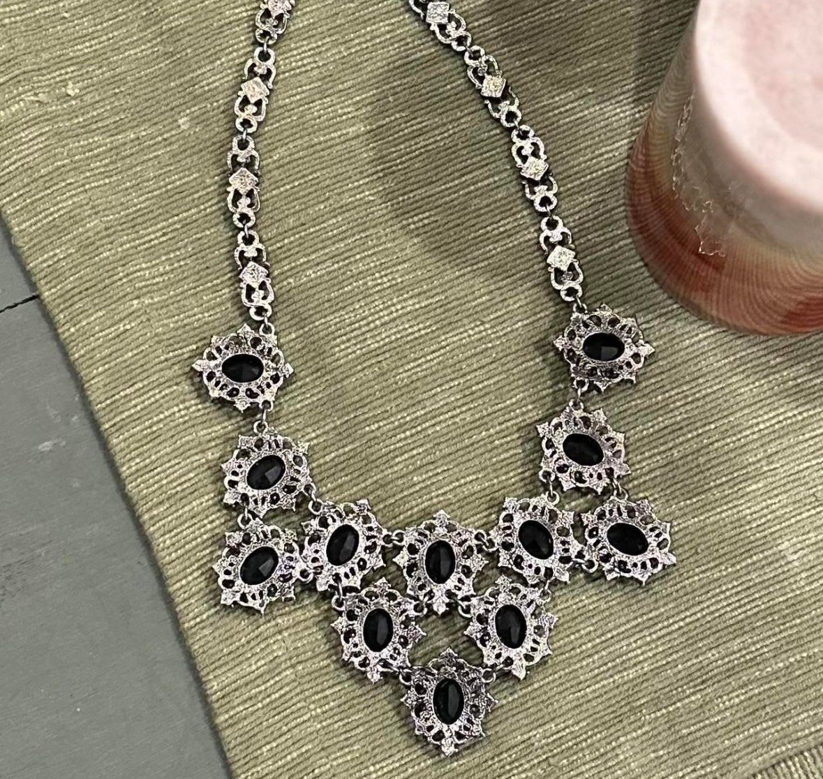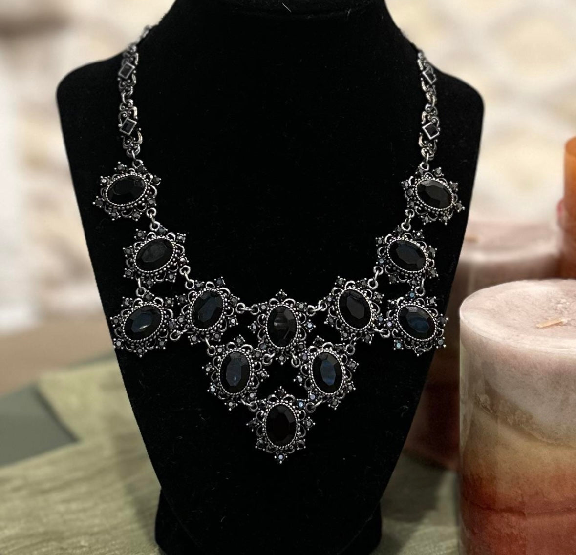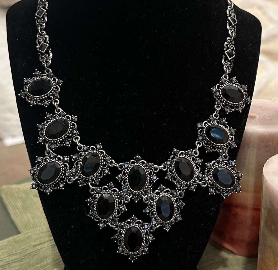 Vintage Bib Black Faceted Crystal Hematite Rhinestone 18" Long Necklace