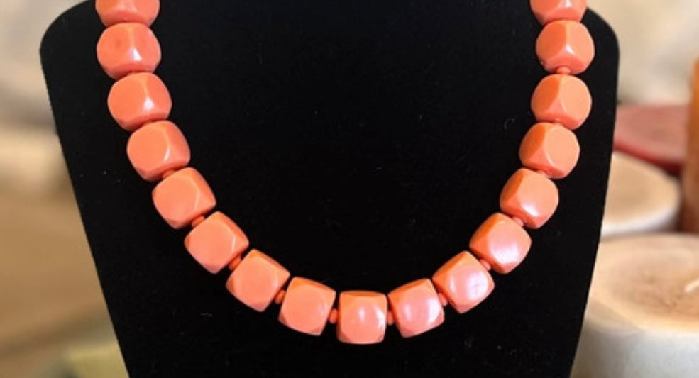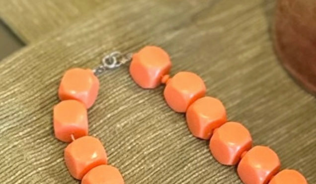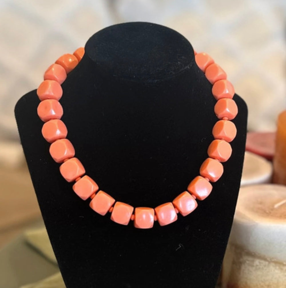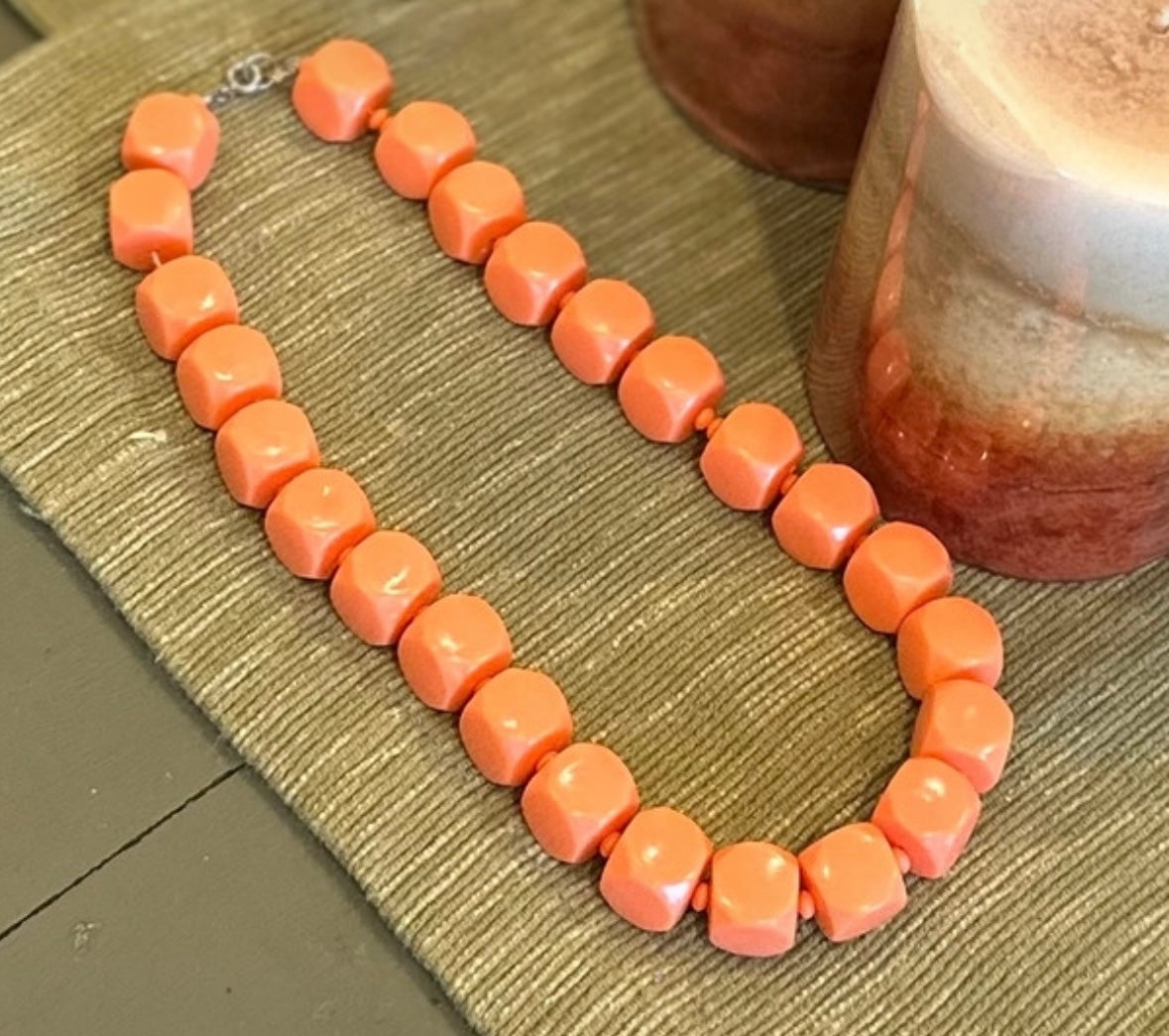 Vintage Coral/Apricot Lucite Beaded Square Choker/Collar Chunky Retro 15 1/2 Inch Necklace with Gold Tone Clasp Hook