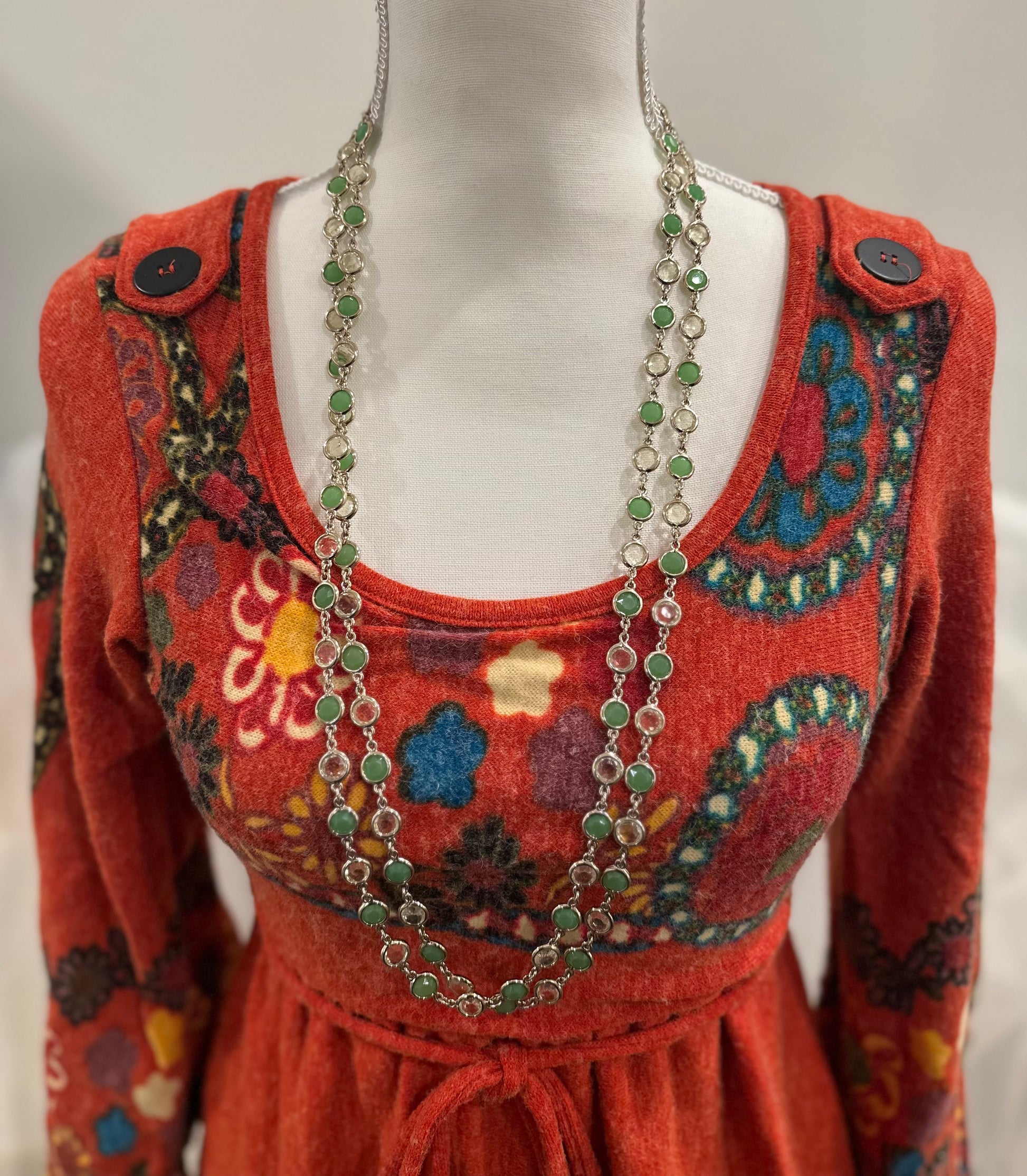 Vintage signed Talbots double strand gold tone light green and jade crystals 32” inch long necklace