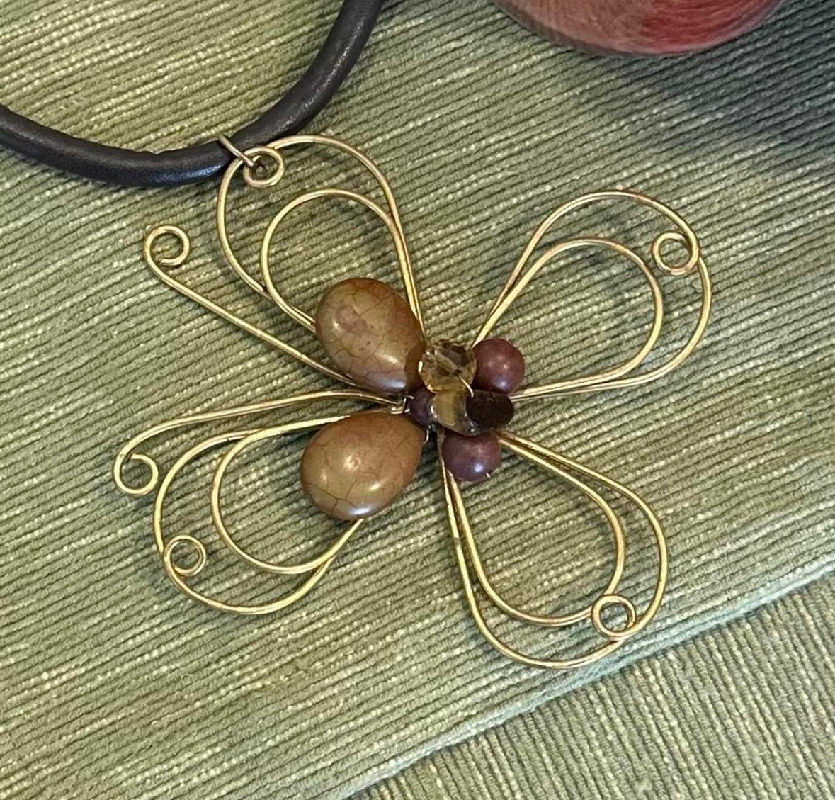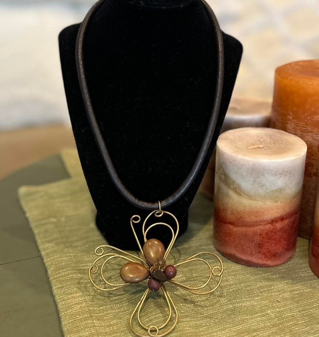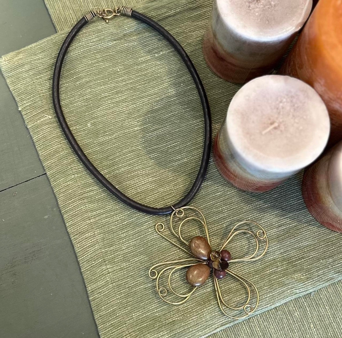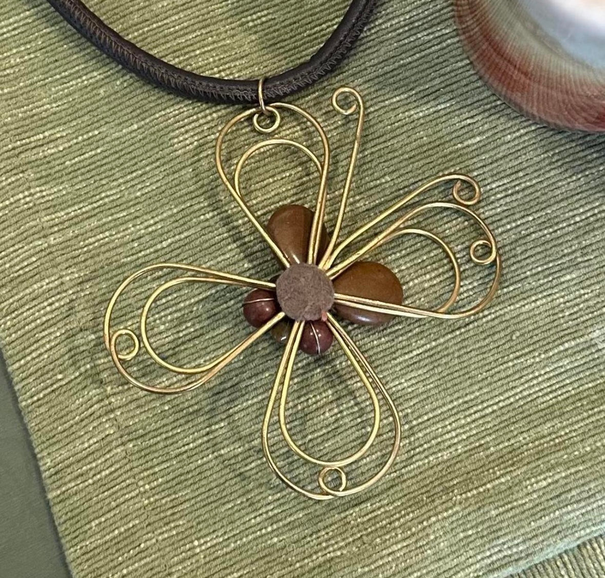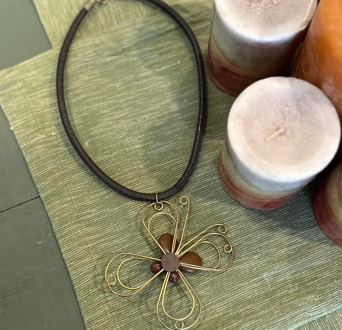 20" inch brown leather necklace with natural copper wire flower pendant with brown stones, faceted beads and brown beads